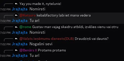 Vienu no šīm lomām iegūst, līdzko esi pievienojies serverim. Tradīcija mūsu vidū bijusi, ka moderatori prasa nupat iegājušam biedram lomu, taču tagad prasa arī pieredzējušākie tērzētāji